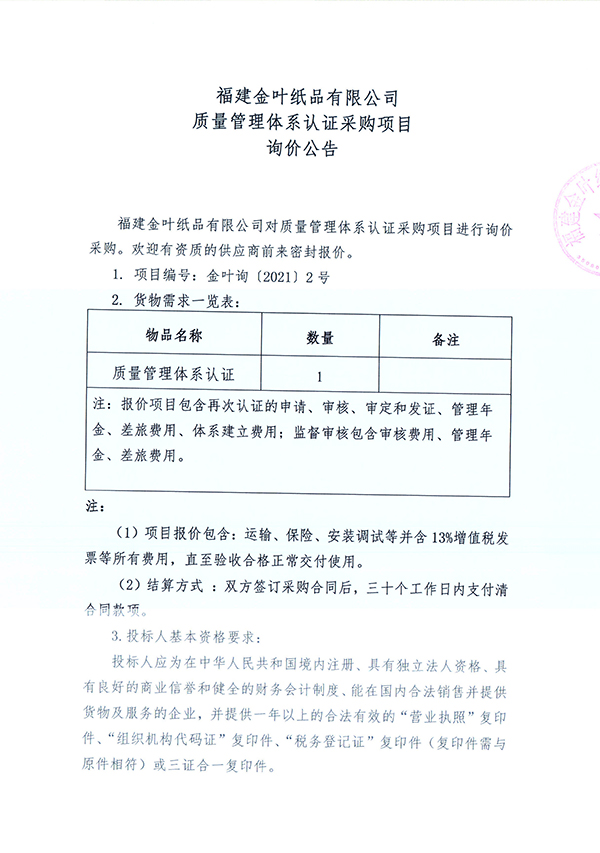 質量管理體系認證采購項目詢價公告