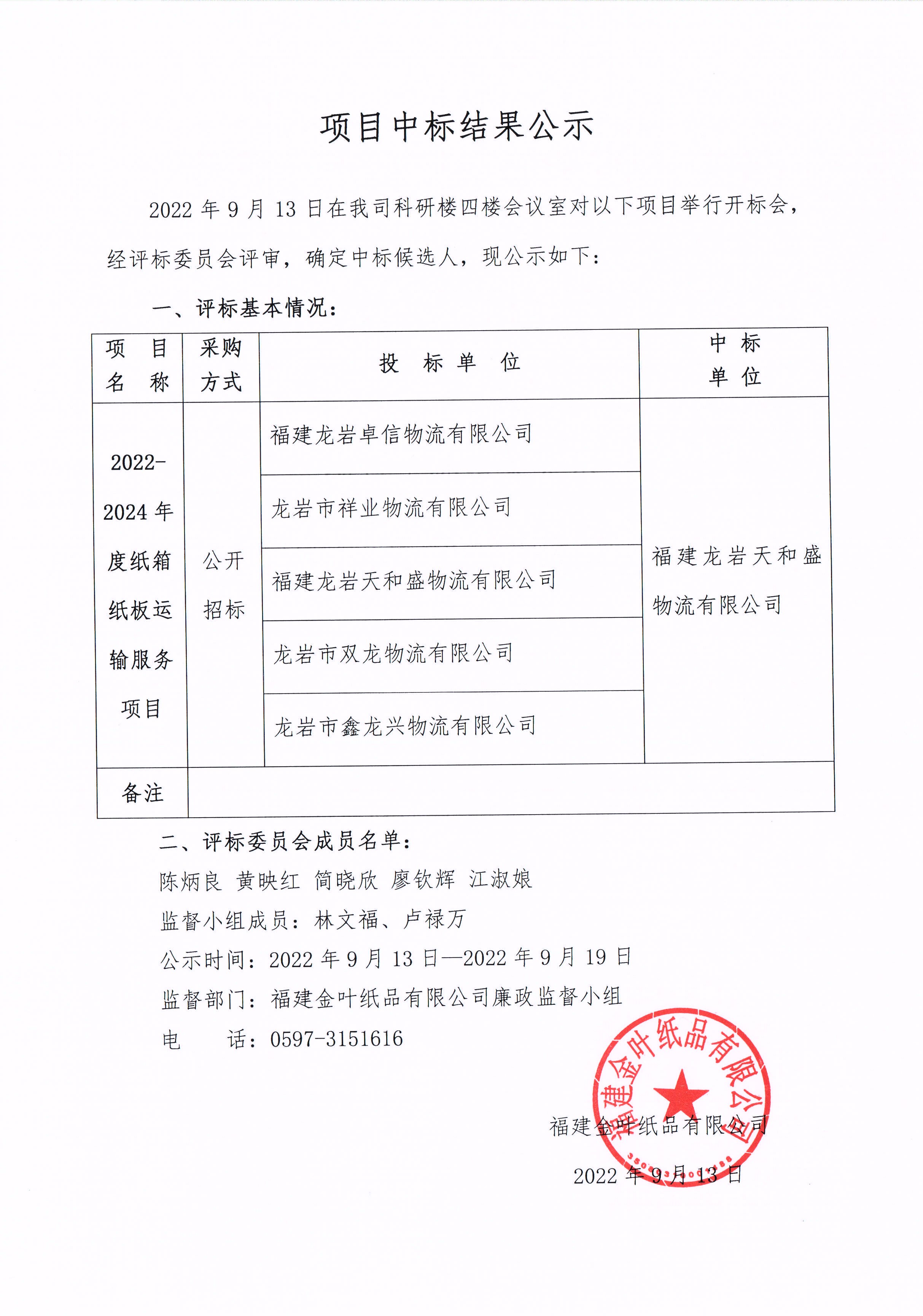 2022-2024年度紙箱紙板運輸服務(wù)項目中標(biāo)結(jié)果公示