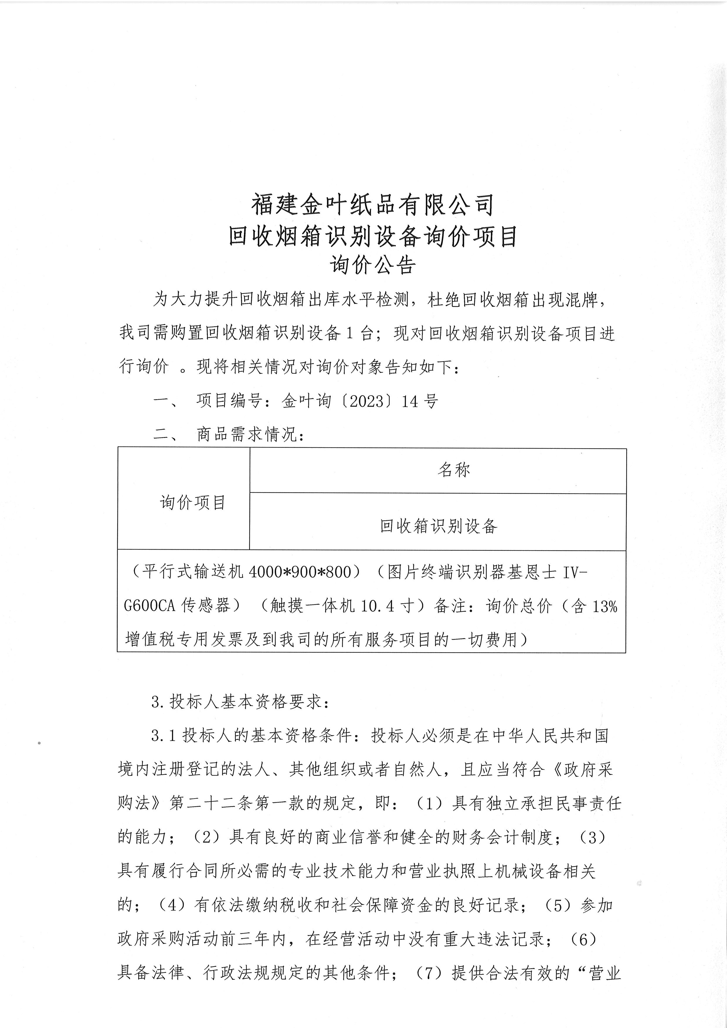 福建金葉紙品有限公司回收煙箱識(shí)別設(shè)備詢價(jià)項(xiàng)目