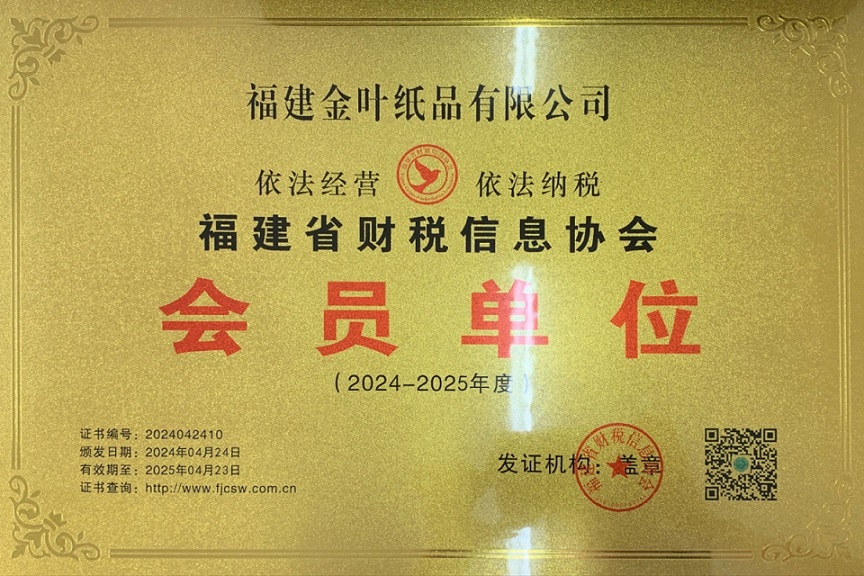近日,經過福建省財稅信息協會嚴格審核,福建金葉紙品有限公司被評為福建省財稅信息協會會員單位。